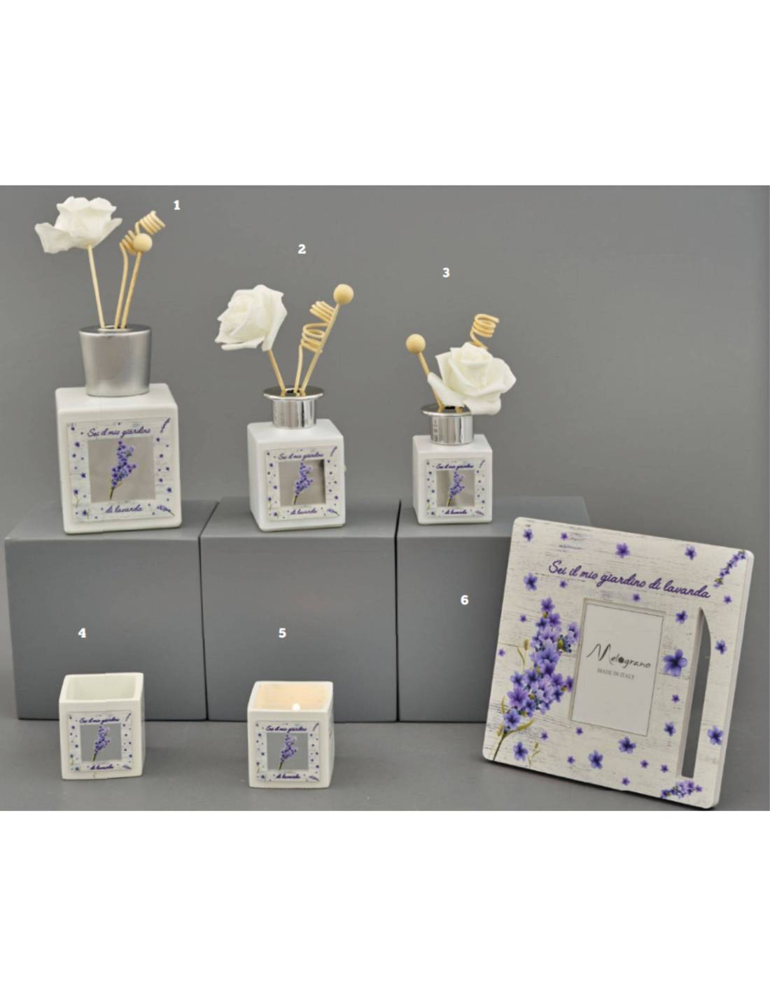 Bomboniere utili eleganti con decoro lavanda e frase 'Sei il mio giardino di lavanda'.