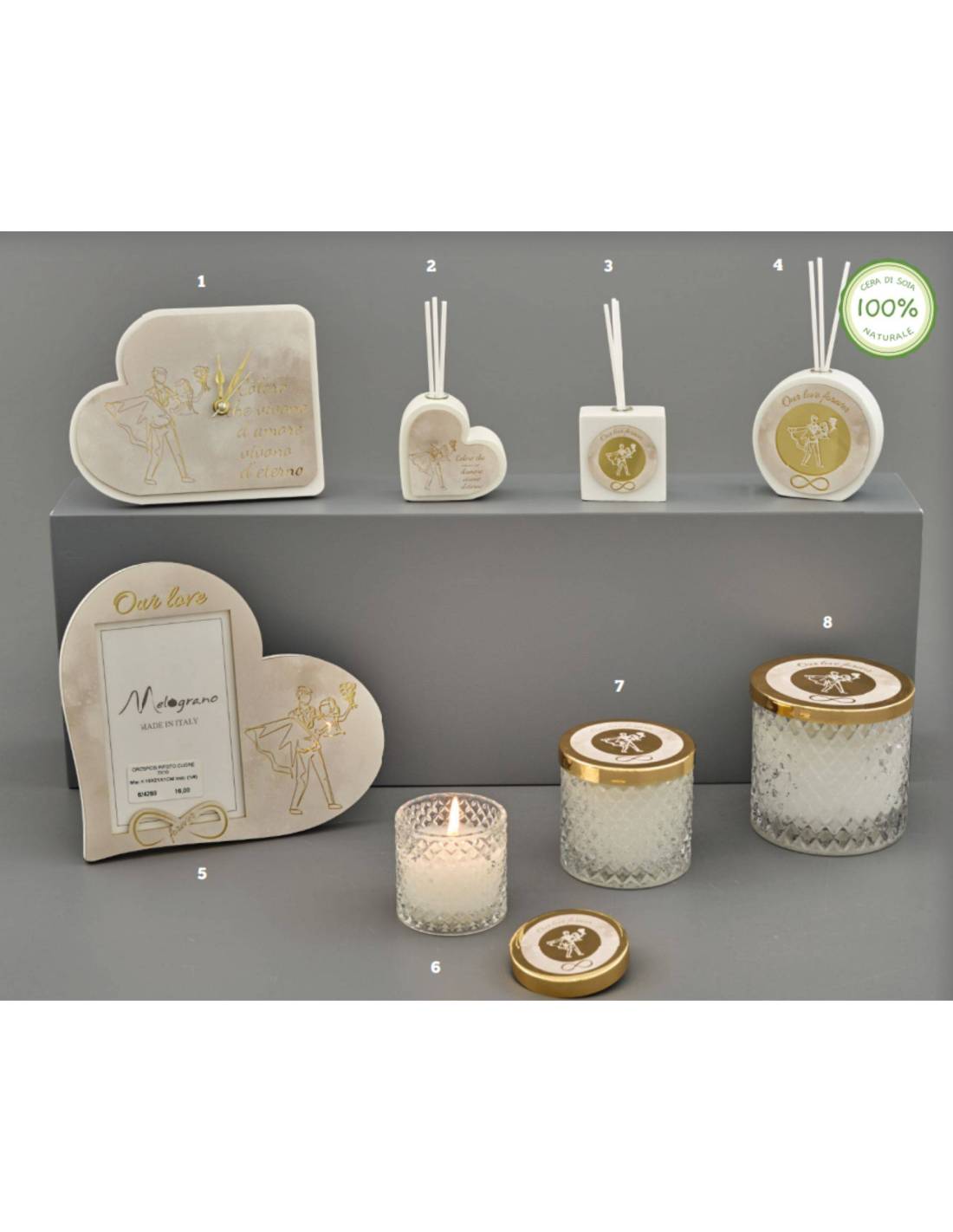 Bomboniere particolari sposini frase 'Coloro che vivono d'amore vivono d'eterno' con possibilità di scelta tra orologi, profumatori, candele, ecc...