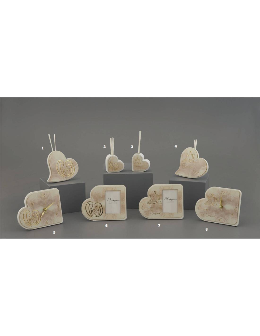 Bomboniere eleganti cuore simboli sacri con possibilità di scelta tra diffusore, orologio o portafoto.