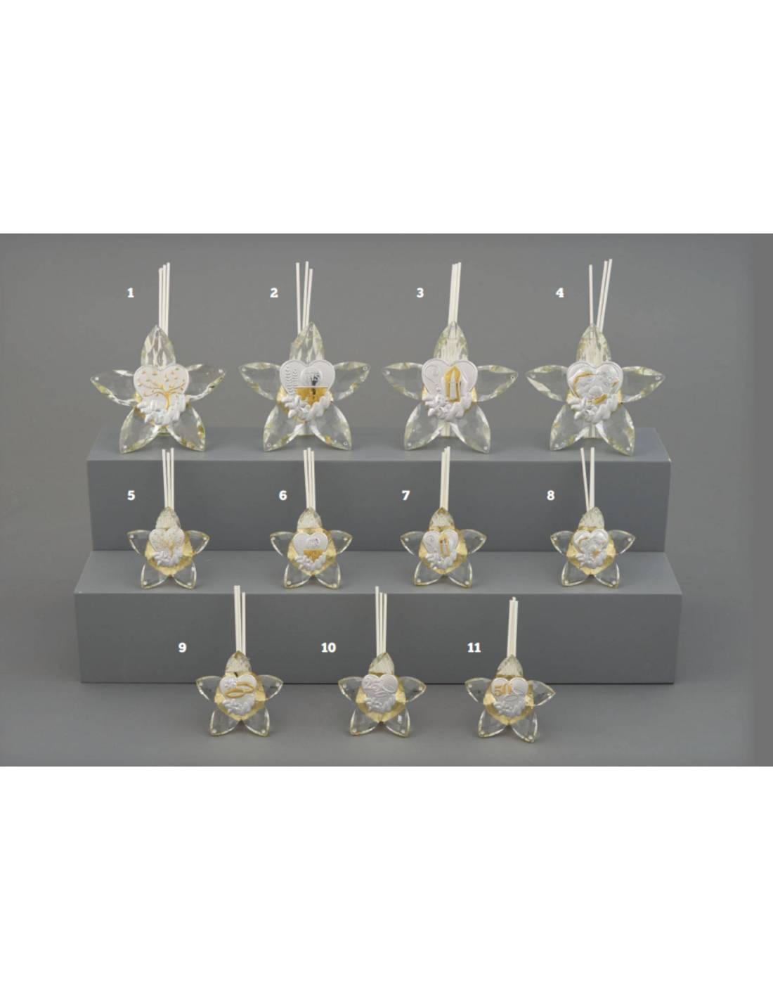 Bomboniere raffinate ed eleganti stella in cristallo con placca icone sacre argentate e dorate in base all'evento.