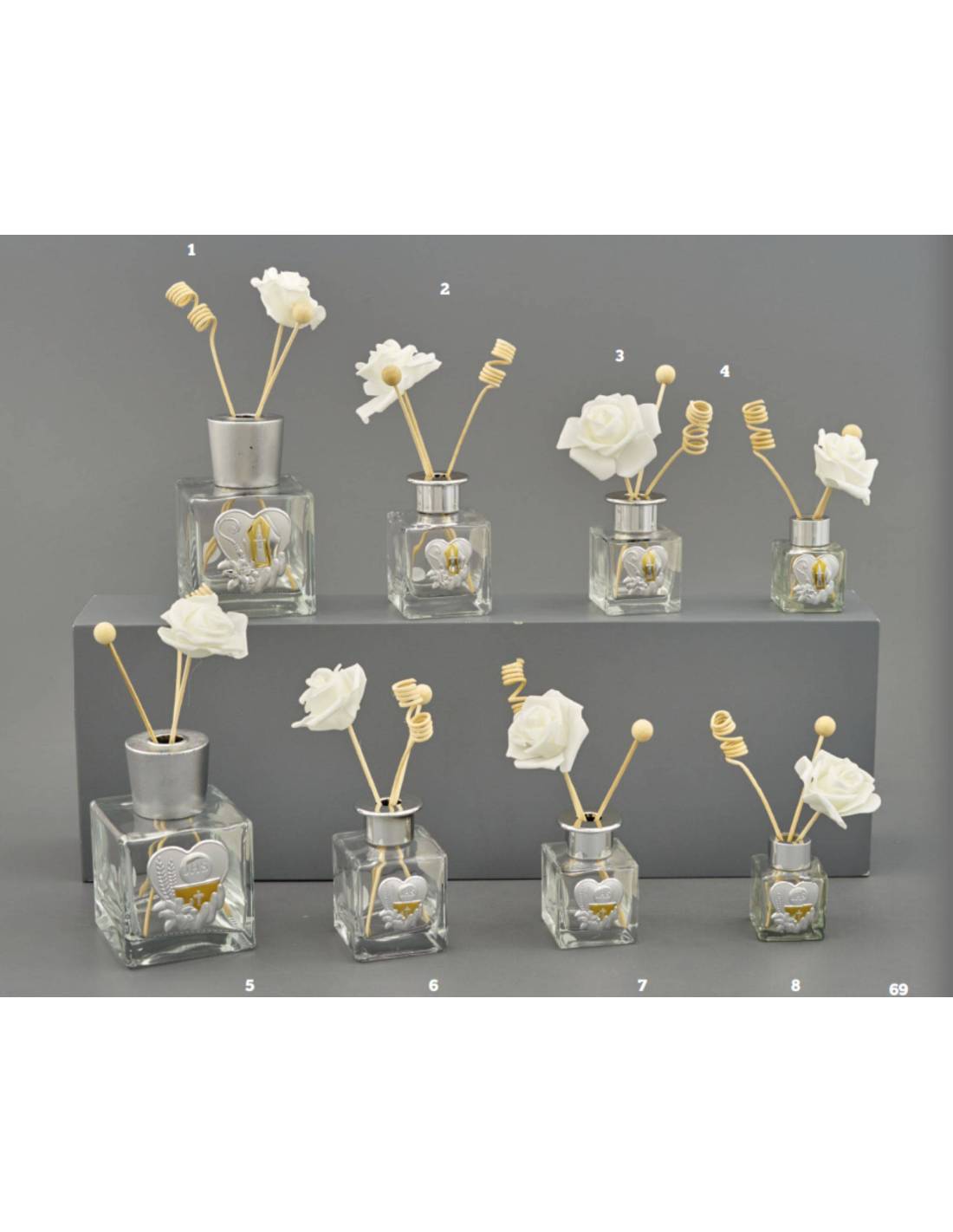 Diffusori ambienti quadrati con placca cuori simboli sacri, tappo argentato e decori bellissimo fiore bianco.
