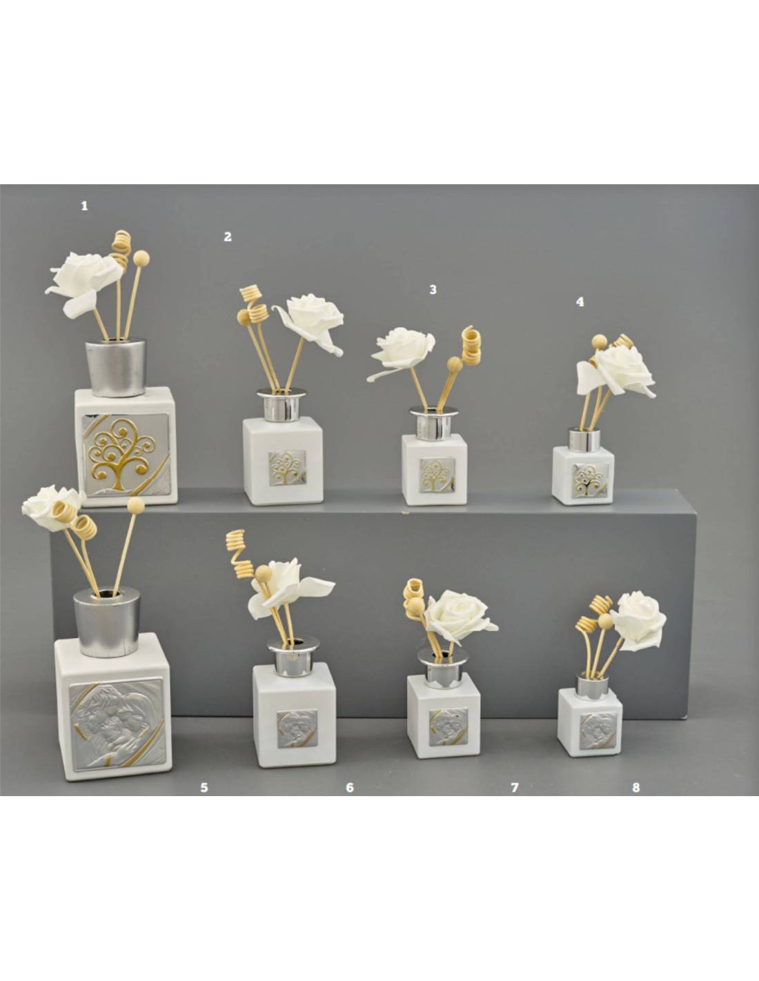 Bomboniere raffinate ed eleganti diffusori quadrati bianchi con placca evento, tappo dorato o argentato e fiore rosa bianca.