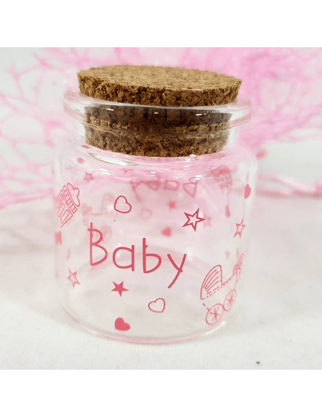 Un vasetto in vetro con stampe rosa, un idea originale come portaconfetti nascita.