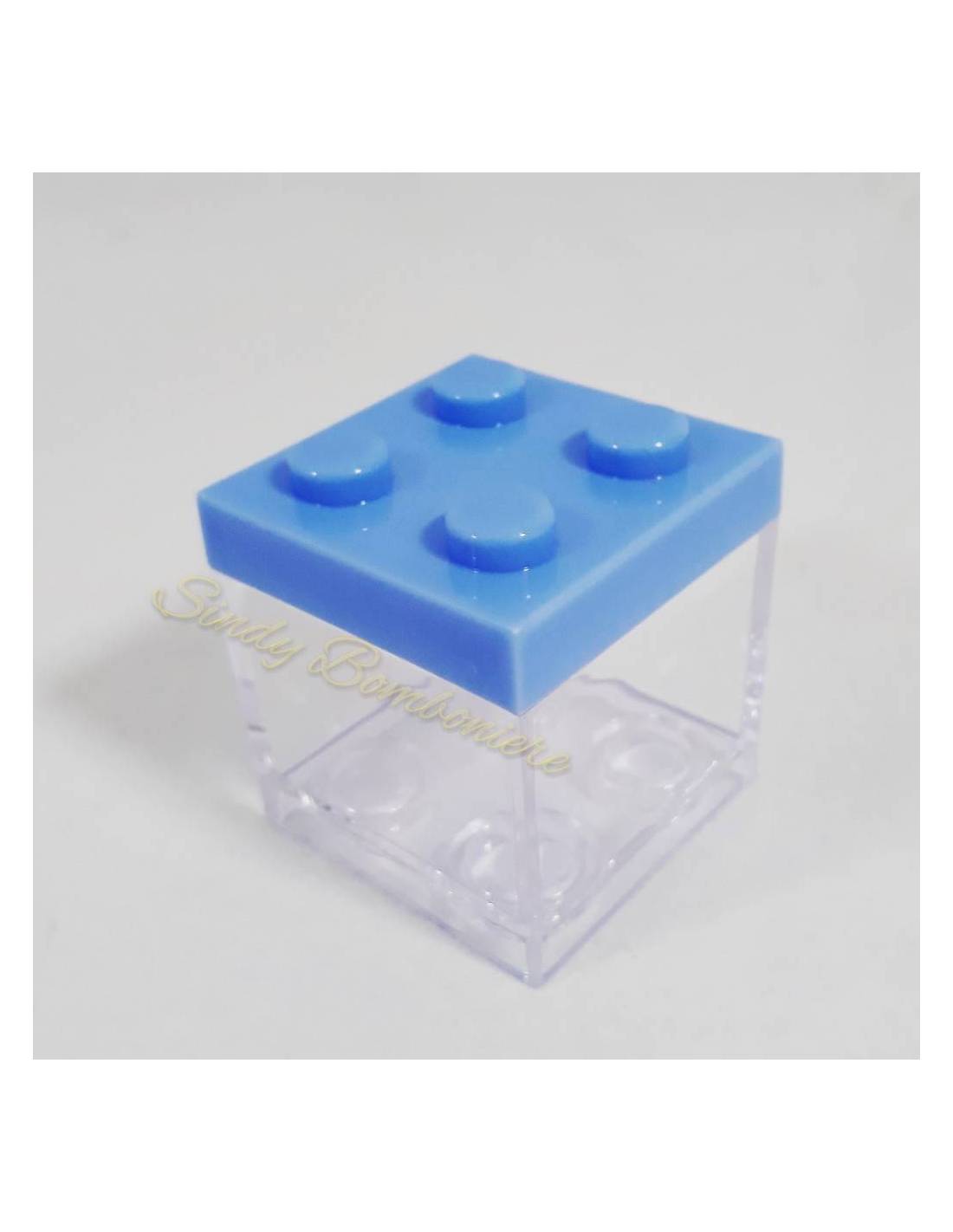 Portaconfetti celeste in plexiglass bomboniere nascita tipo Lego