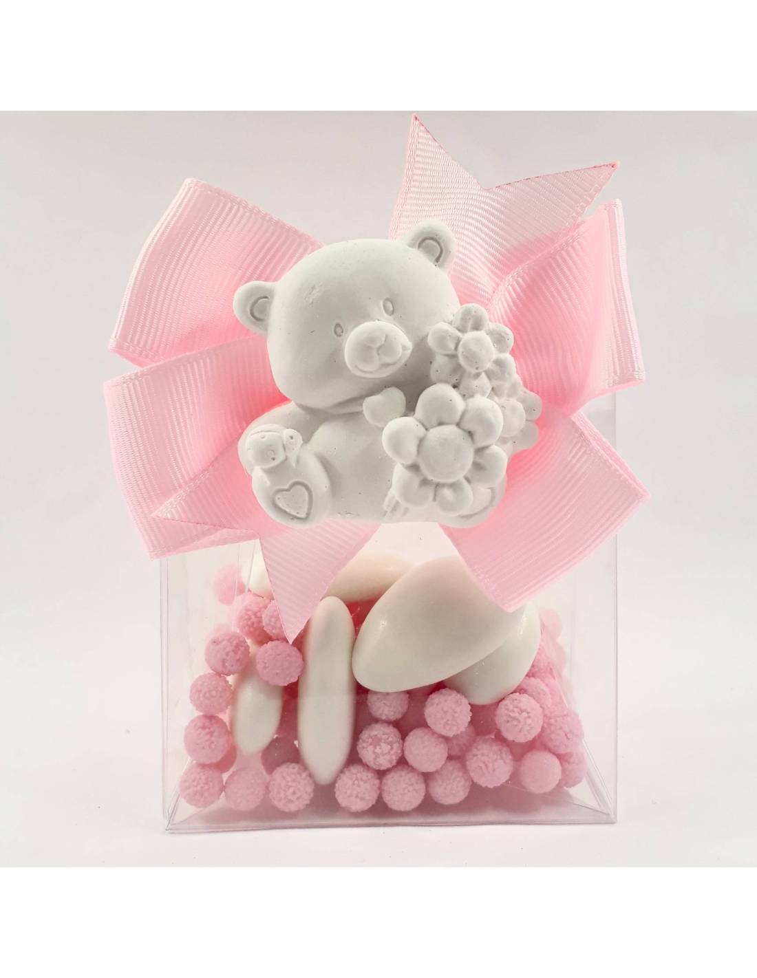 Scatole per confetti Nascita per Bimba, cofanetti portaconfetti originali ed economici con nastri e gessetti profumati a forma di orsetto