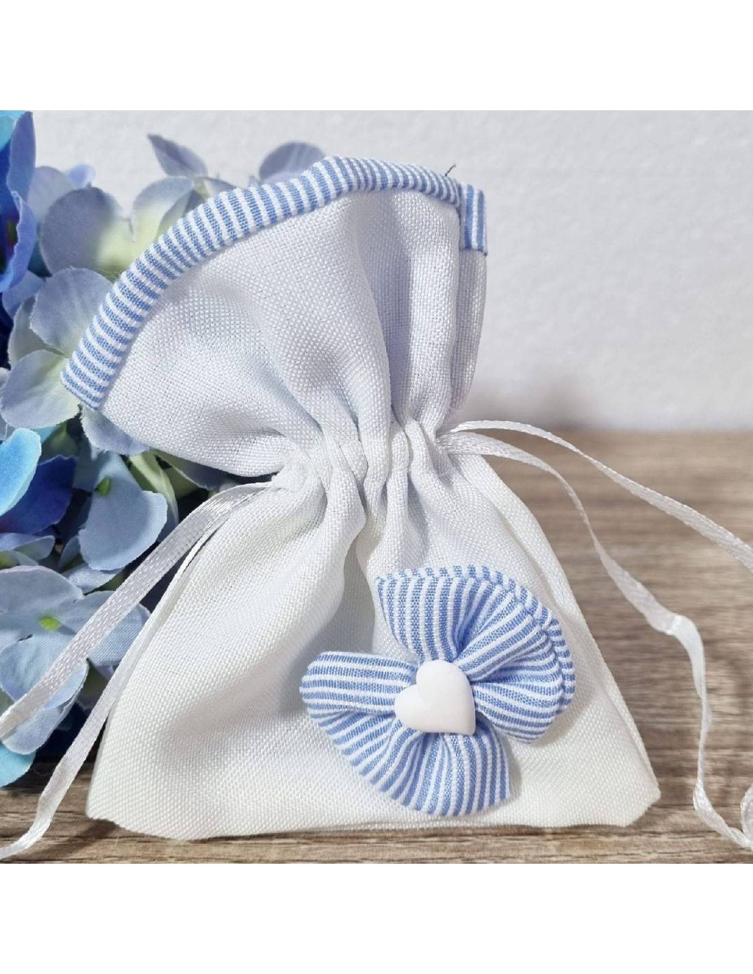 Sacchetti portaconfetti nascita bimbo cuore fiocco rigatoSacchetti portaconfetti nascita bimbo cuore fiocco rigato
