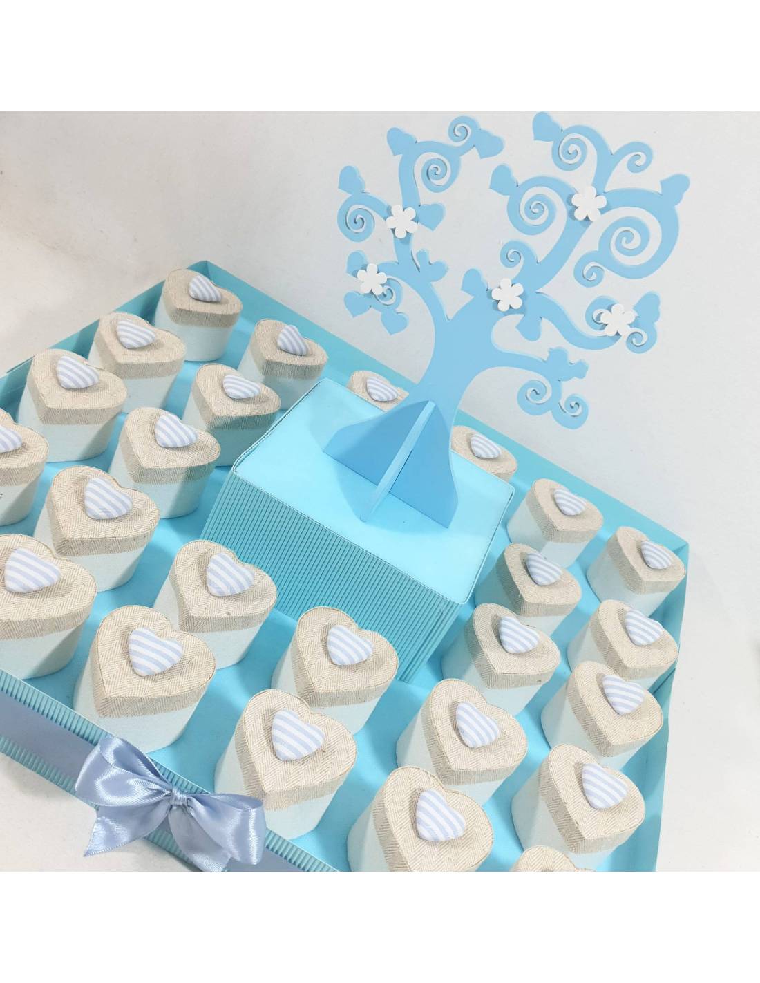 Il cesto è composto da 32 scatoline portaconfetti decorate con un fiocchetto di colore celeste. La struttura si presenta come in foto, quindi gia decorata con nastro e centrale albero della vita.