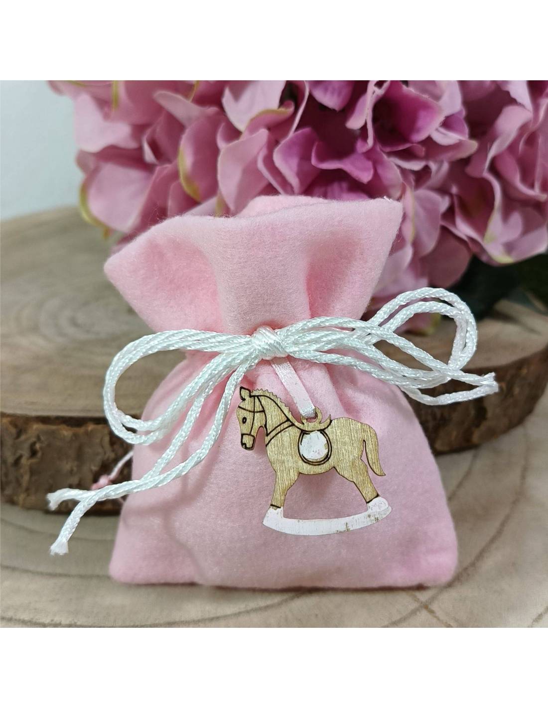 Sacchetti nascita per bimba originali per confettata con fiocchetto e cavalluccio a dondolo in legno.