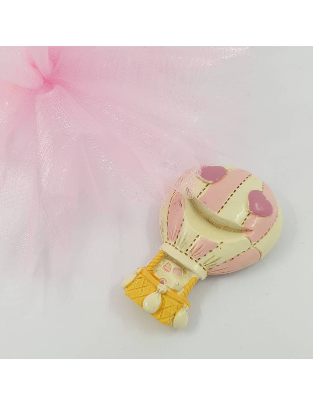 I sacchetti portaconfetti nascita bimba hanno il decoro di un fiocco con calamita in resina che rappresenta un coniglio nel fagottino rosa e panna.