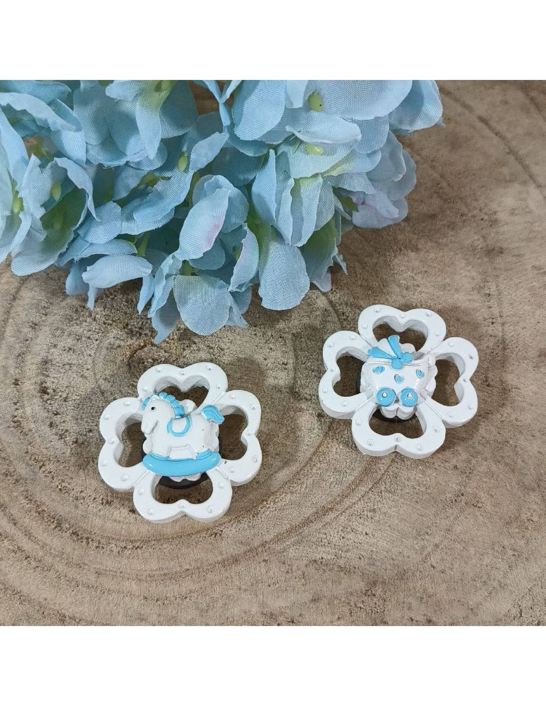 L'oggetto ha forma tonda ha al centro il cavalluccio e la carrozzina di colore azzurro per realizzare bomboniere nascita economiche.
