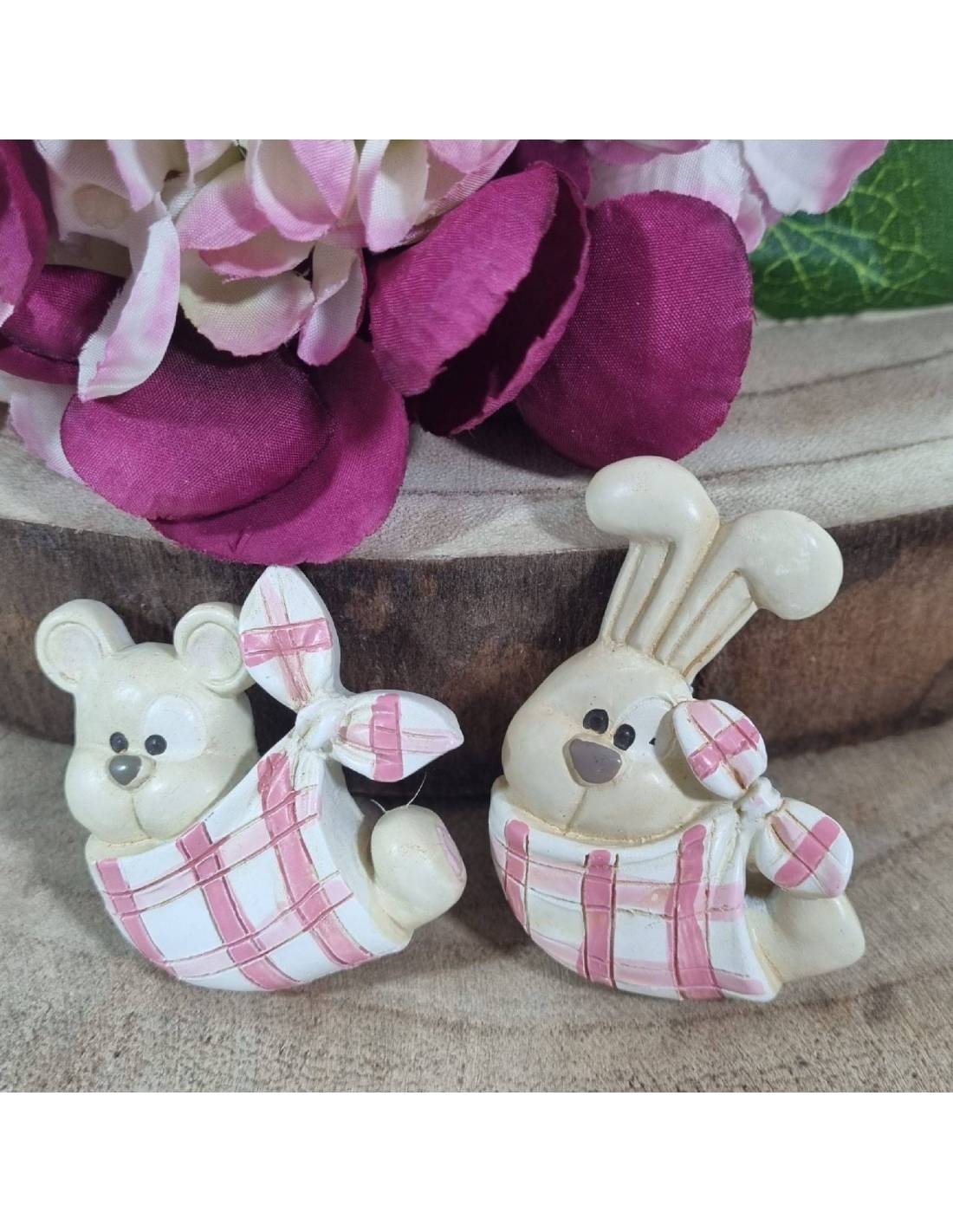 Bomboniere nascita femmina conigliette rosa calamite in resina dipinte a mano.