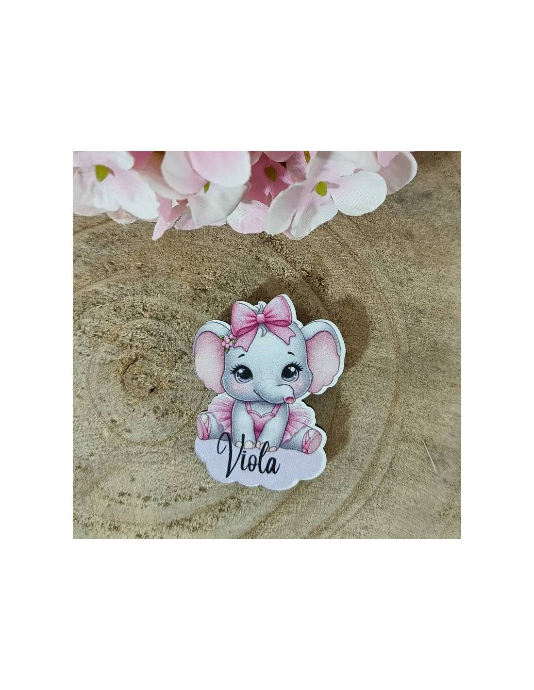 Idee bomboniere per Nascita calamite magnetiche in legno elefantino bambina con nome personalizzato ideale anche per evento Battesimo o Compleanno.