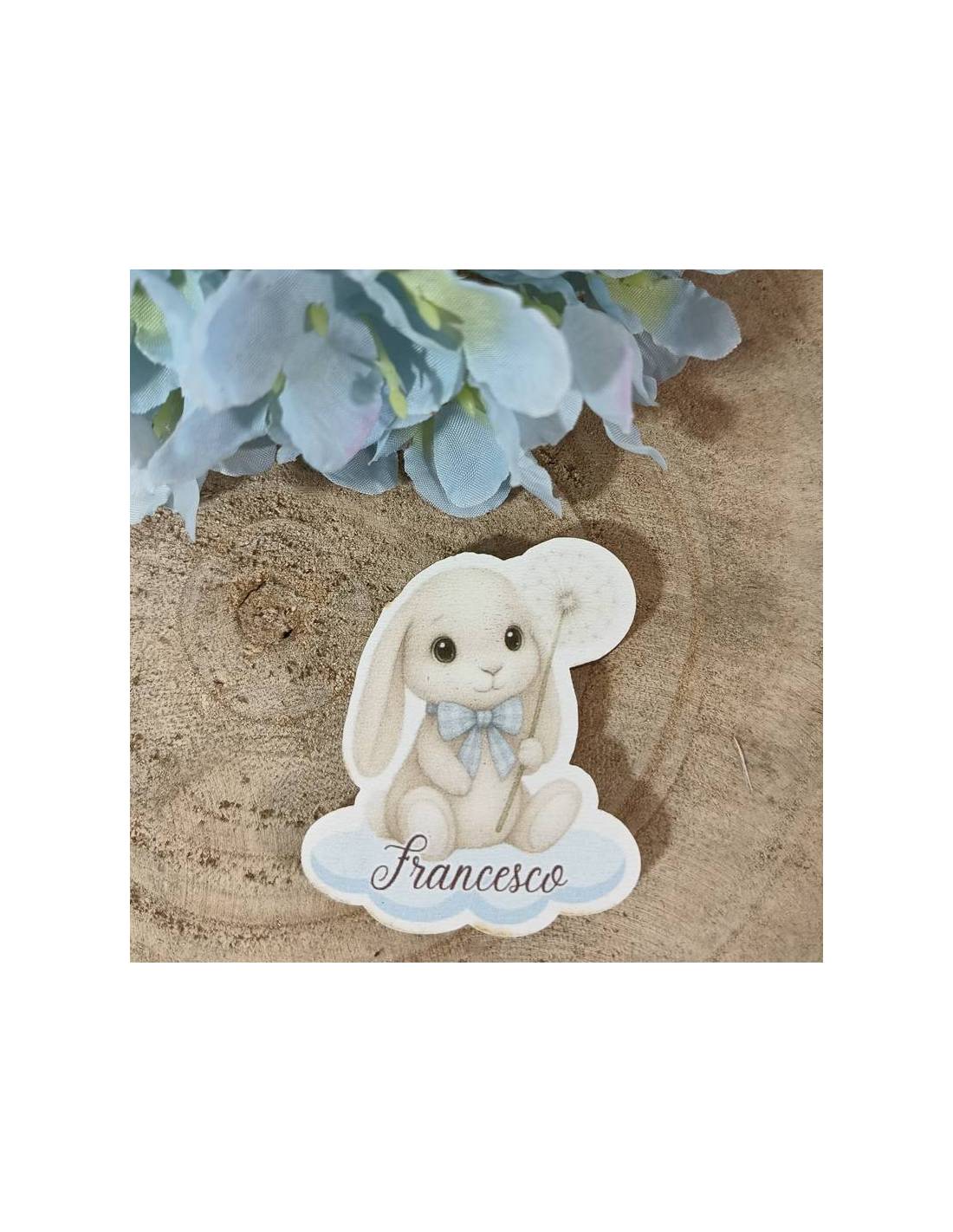 Bomboniere animaletti calamite in legno che rappresentano tenero coniglietto su nuvoletta con in mano dente di leone nome personalizzato ideale per evento Battesimo, Nascita, Compleanno, ecc...