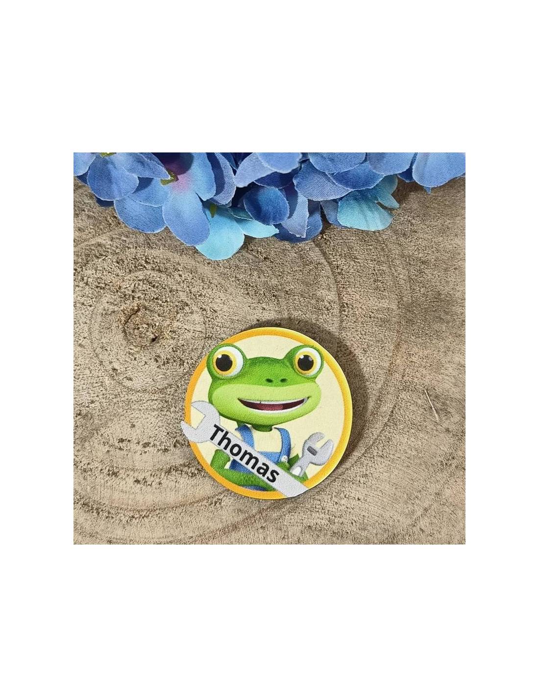 Bomboniere animali magneti calamite tonde in legno rana con nome personalizzato del festeggiato.