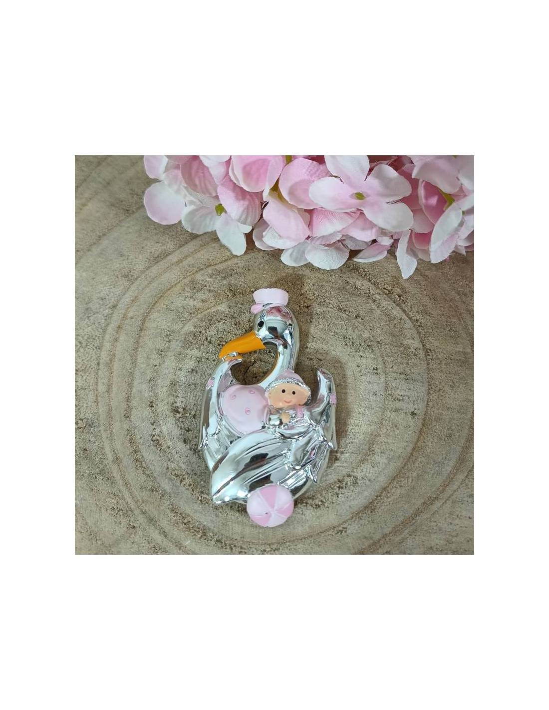 Bomboniere Nascita bimba calamite cicogna rosa e argentata