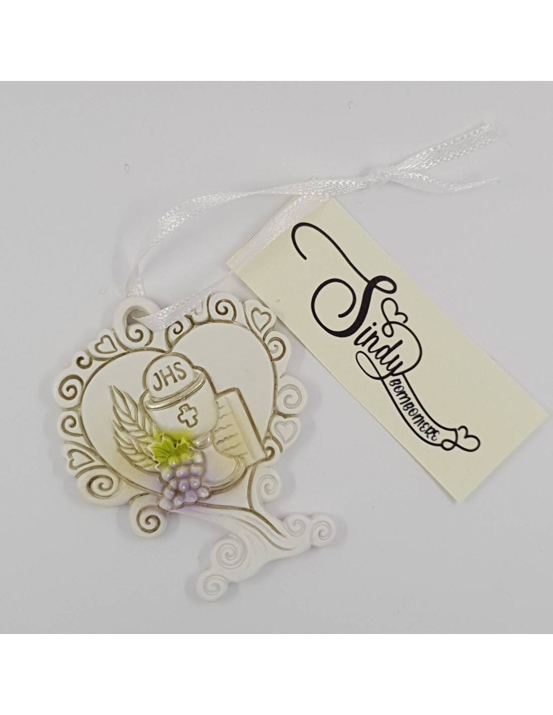 Una bomboniera come ricordo per la Prima Comunione che rappresenta un albero nella forma di un cuore con il disegno dell'Eucarestia, le sue caratteristiche sono: