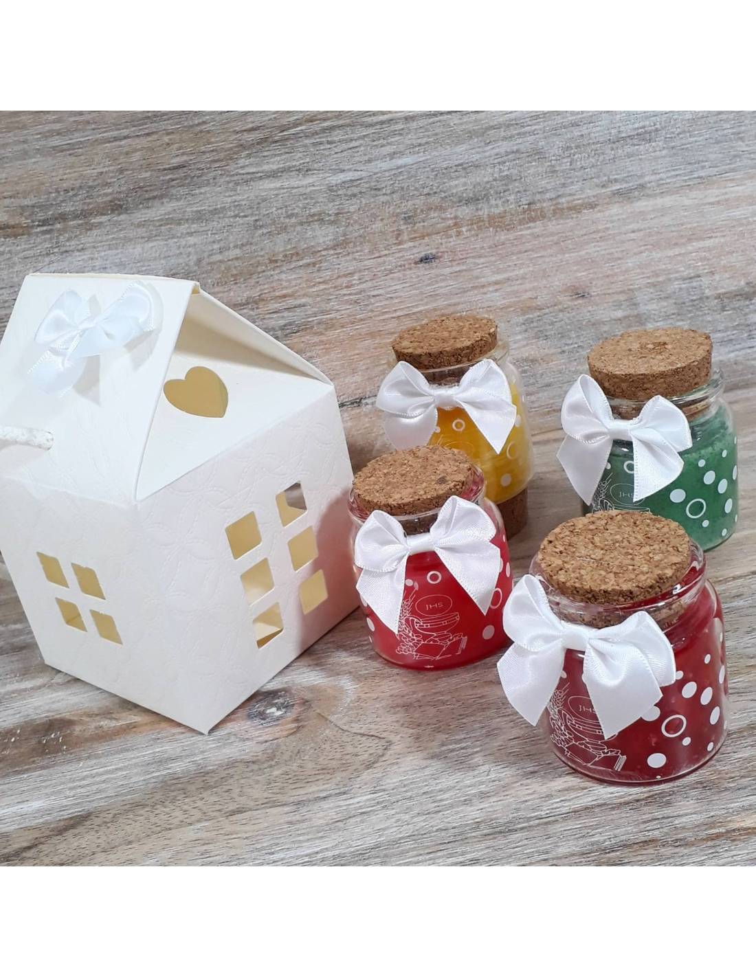 La bomboniera è una candela in vetro con cera Yankee Candle compresa di tappo in sughero decorato con un fiocchetto e la stampa in bianco che rappresenta il simbolo Sacro della Comunione + scatola casetta.