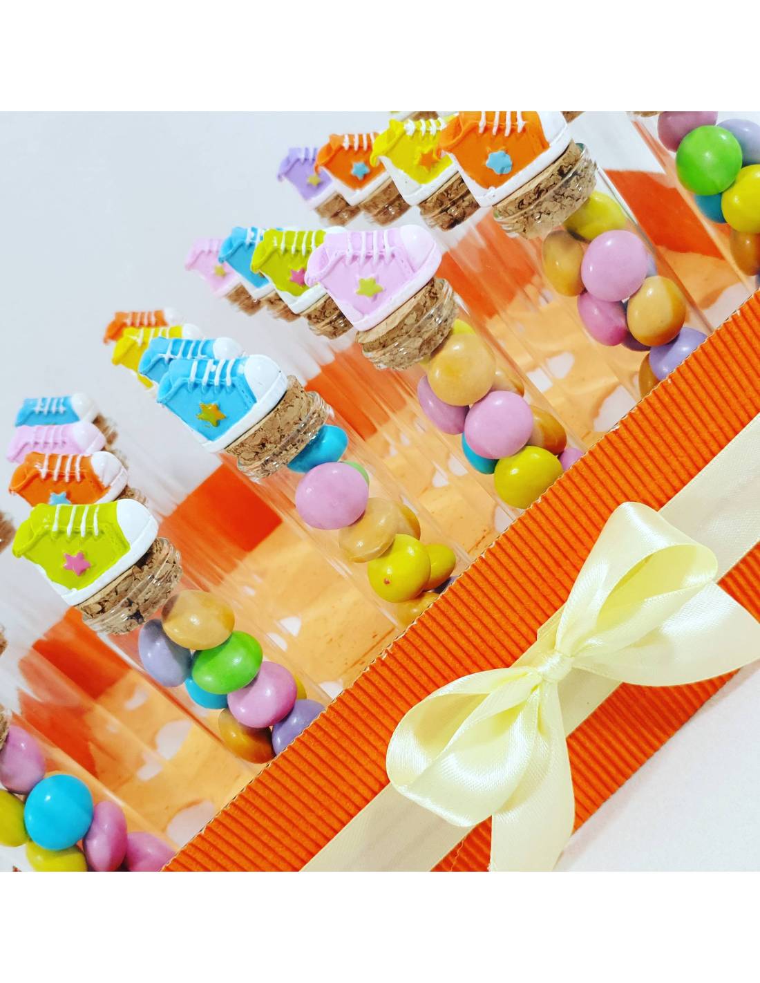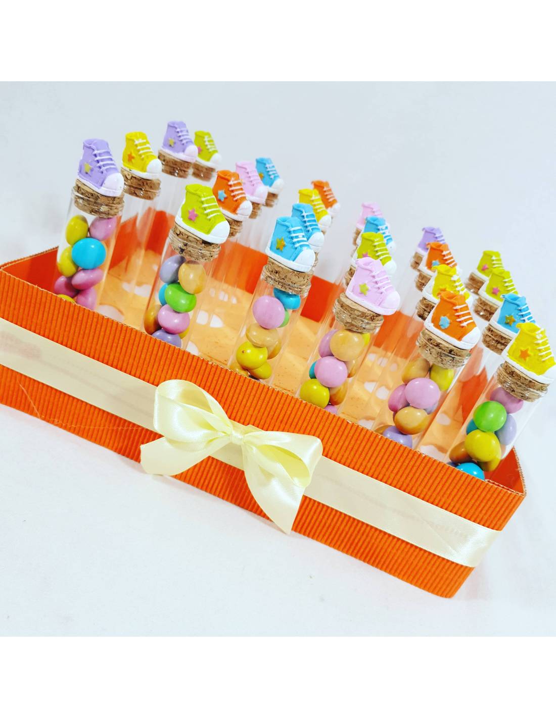 Cestino con 24 provette completo di confetti. Per queste originali bomboniere colorate la spedizione è gratuita, il cesto arriverà già con il nastro, 24 provette + 24 scarpette e confetti maxtris nibble come in foto, il tutto a kit di confezionamento facile da assemblare utilizzando un pò di colla e in più sindy vi omaggia i bigliettini personalizzati.