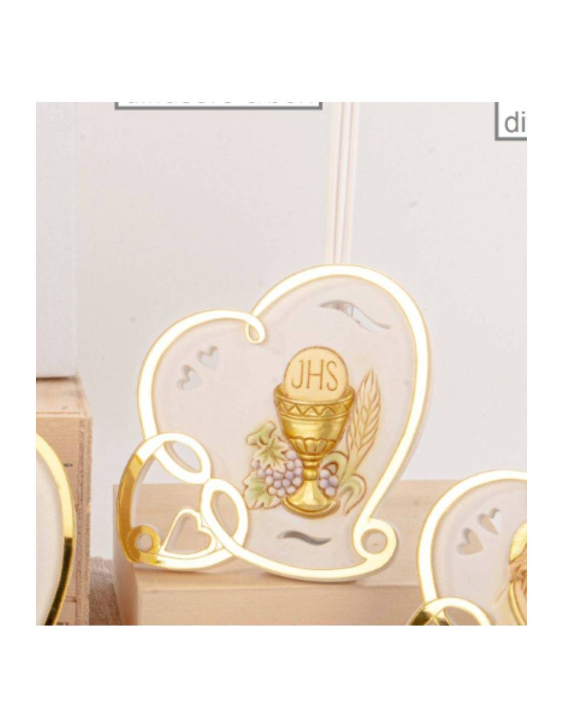 L'eucarestia raffigurata è incisa nel cuore con il calice bianco poggiato un libro aperto con l'uva e il pane, curati e originali profumatori per Comunione.
