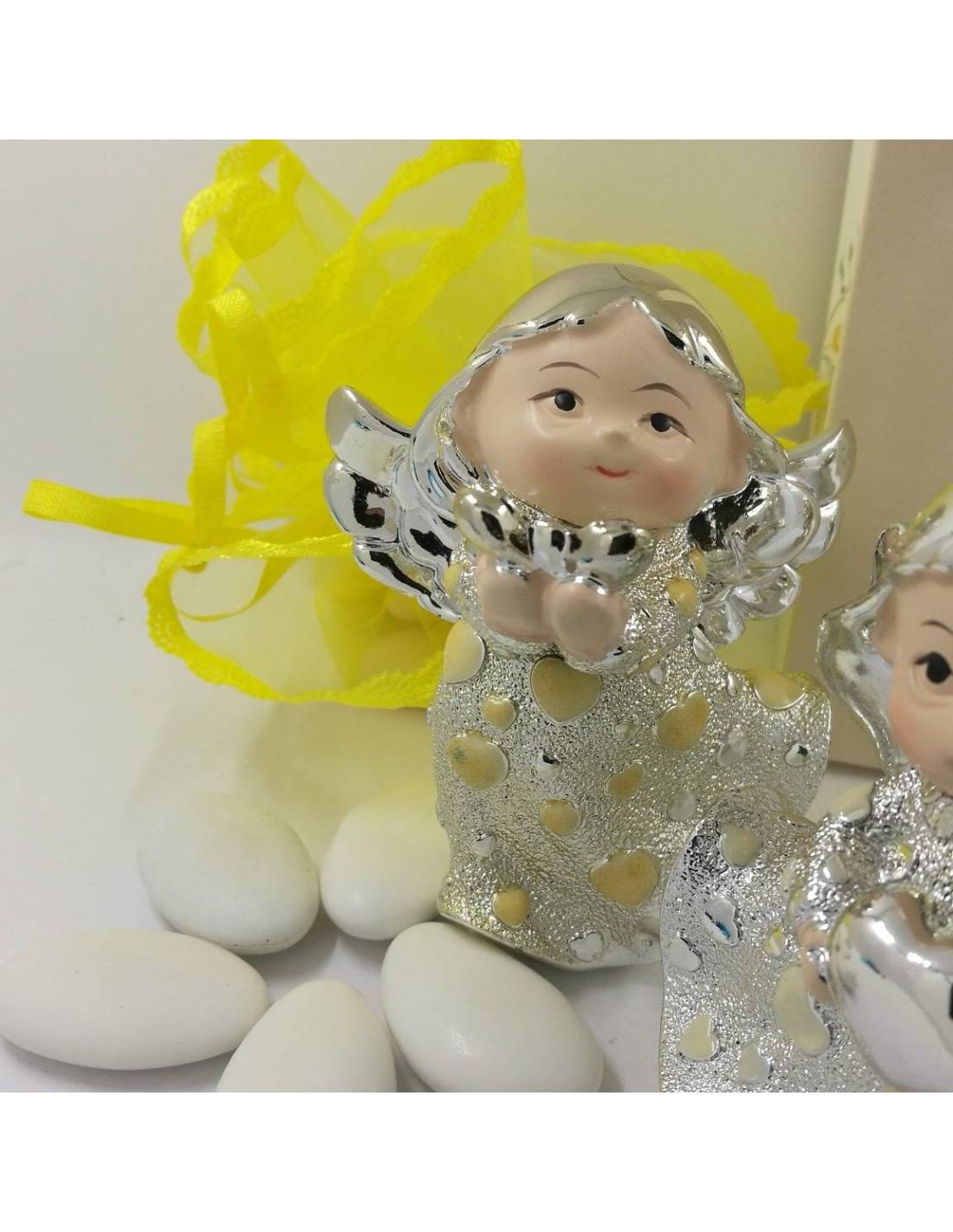 Gli angeli in resina hanno sulla tunica dei cuoricini in rilievo bianchi ideali bomboniere Comunione argento.
