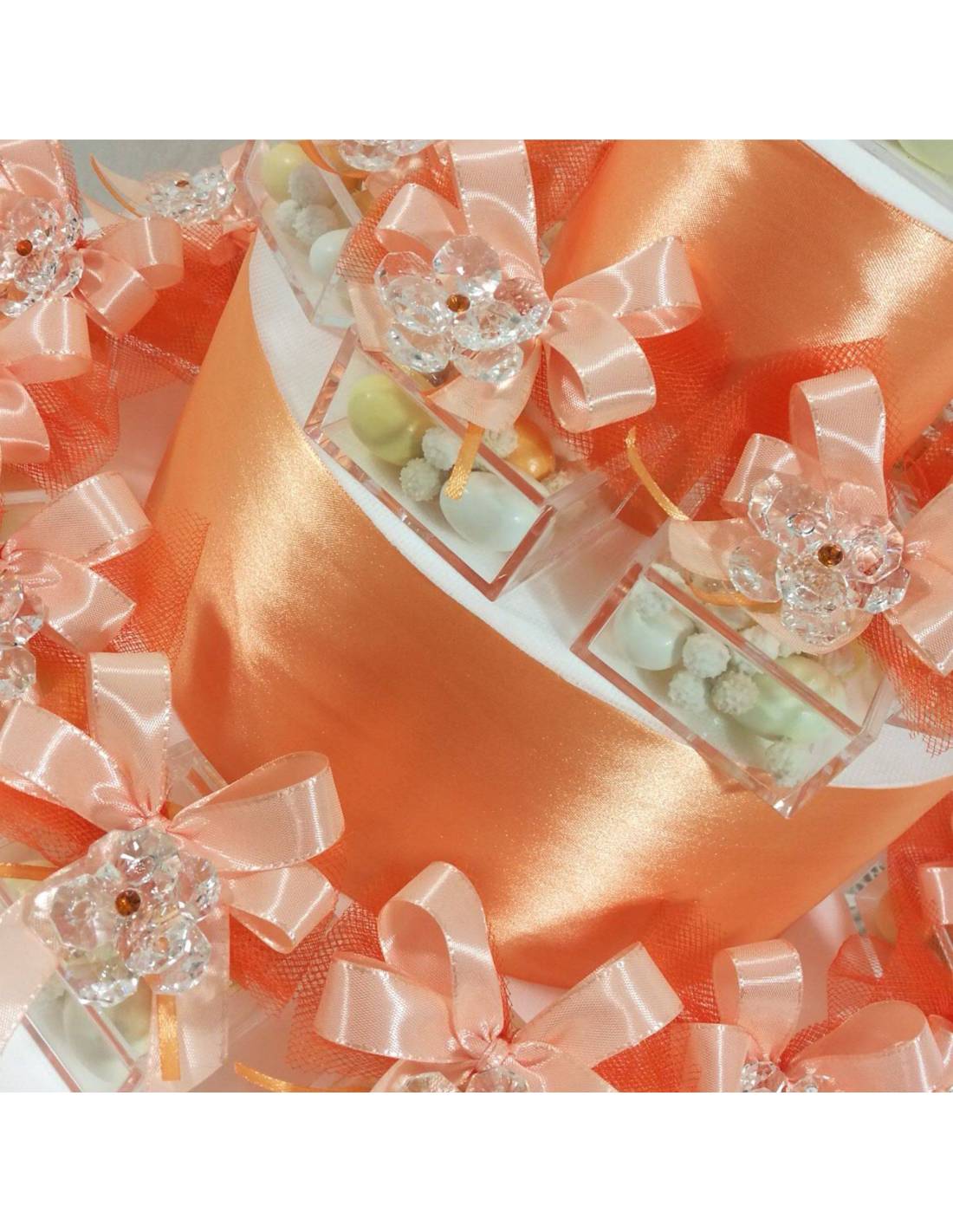 I fiori bomboniere swarovski per Comunione sono confezionati su scatolina in plexiglas con confetti sfumati e mimose abbinati ai nastri dal colore pesco.