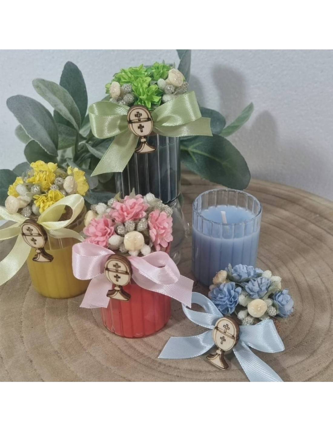 Le bomboniere comunione candele hanno un fiocco con il calice in legno e puoi completare la confezione scegliendo tu stessa nastri, scatole e confetti.