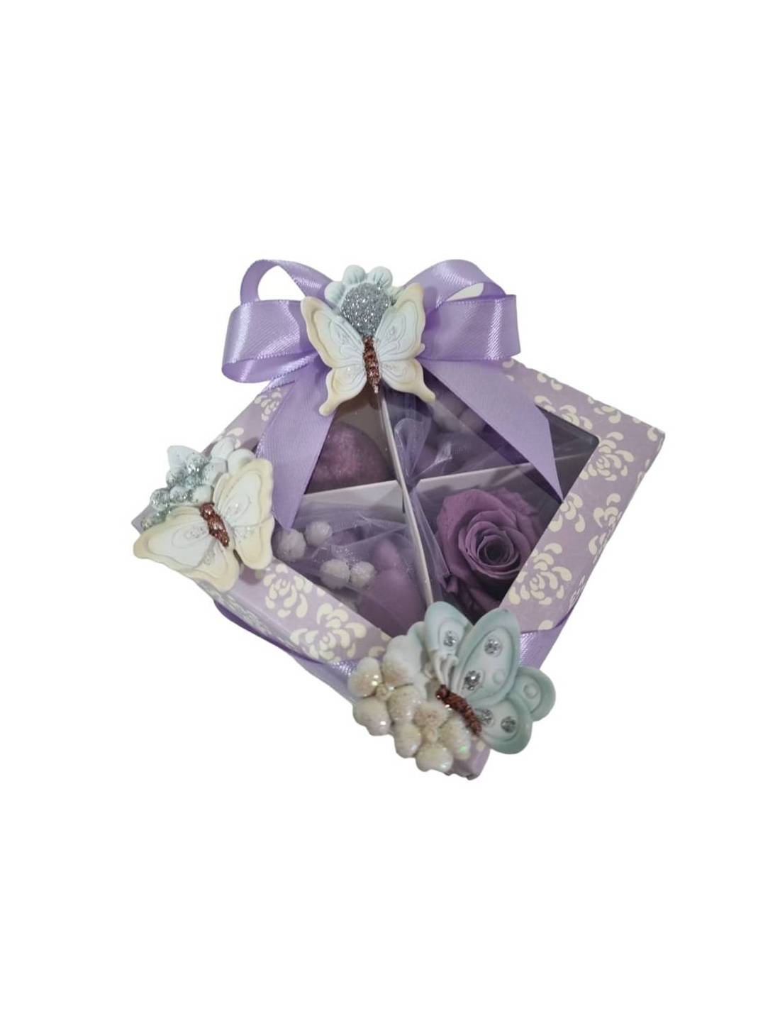 Scatola degustazione dalle tonalità del lilla completa di confetti, marshmallow, rosa eterna, nastro e farfalla bianca in ceramica a calamita.