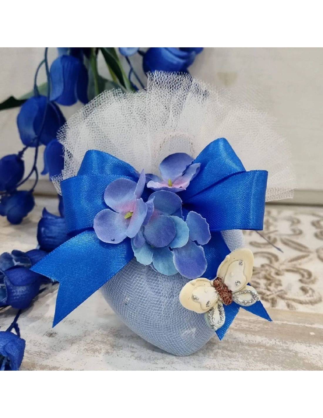 Bomboniere saponetta a forma di cuore confezionata con tulle nastro e fiori e applicazione di farfalla glitter.