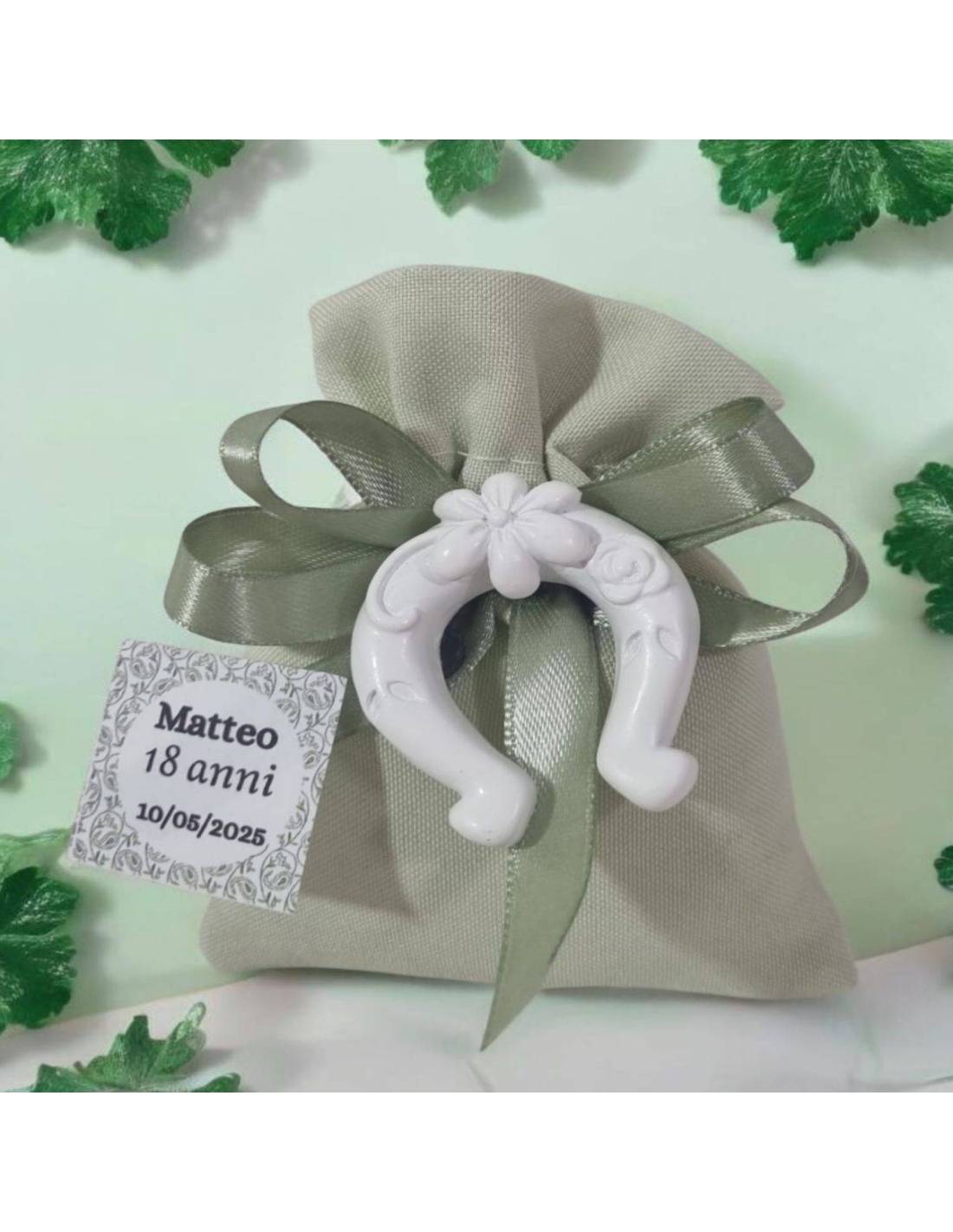 Sacchetti compleanno di colore verde salvia con nastro abbinato e staffa calamita bianca in resina dipinta a mano.