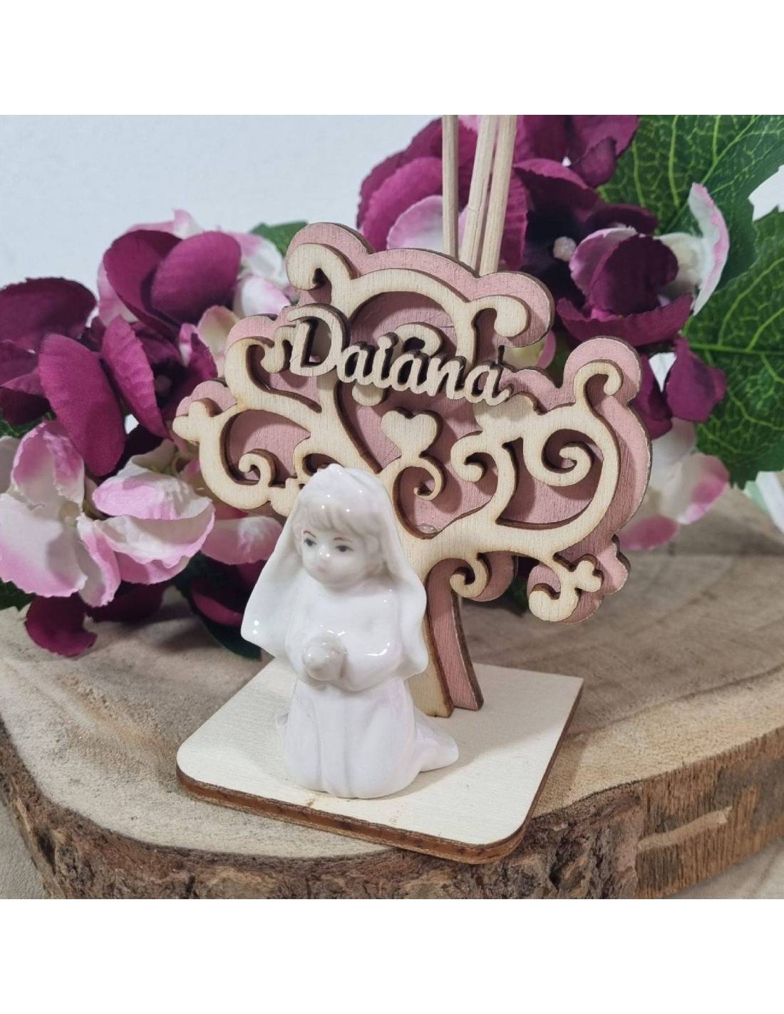 Profumatore bomboniera Comunione albero della vita in lego rosa e naturale con statuetta che rappresenta una bambina in preghiera.