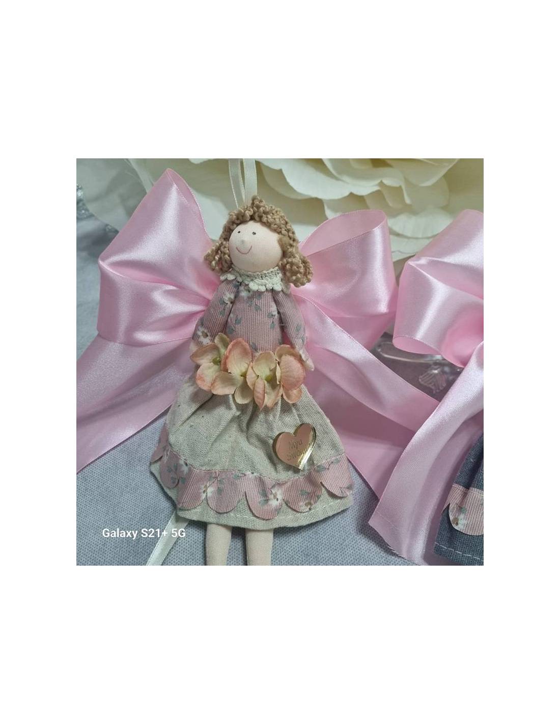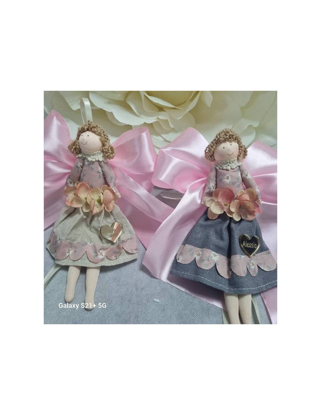 Bambole bomboniere di pezza con fiocco in raso rosa da appendere ottime per evento Comunione bambina.