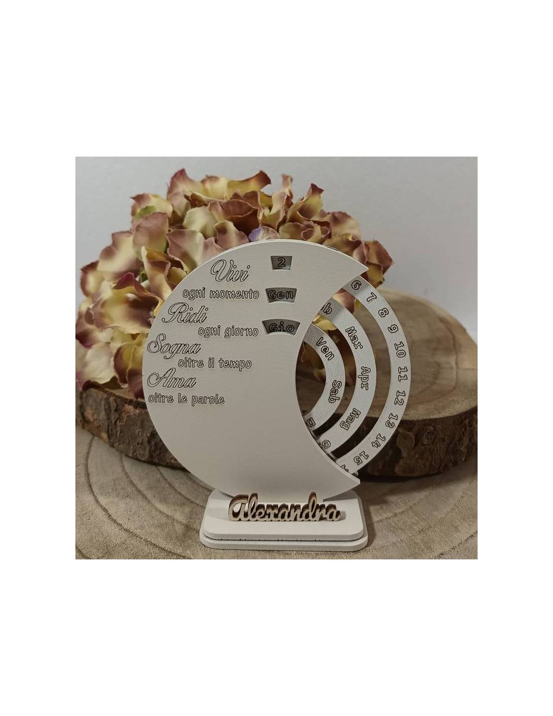 Bomboniere particolari personalizzate calendario con frase incisa "Vivi ogni momento. Ridi ogni giorno. Sogna oltre il tempo. Ama oltre le parole".