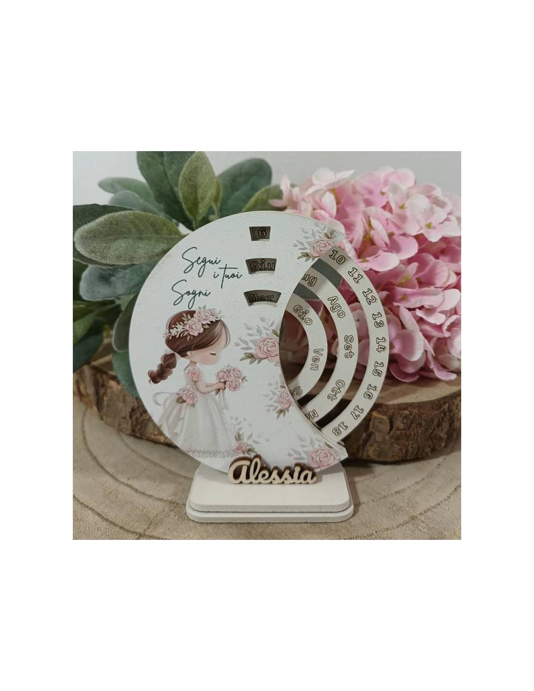Idee bomboniere Comunione calendario perpetuo in legno con frase "Segui i tuoi sogni" e nome personalizzato.