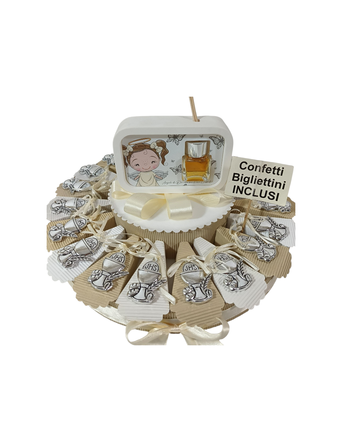 Torta portaconfetti bomboniere Comunione bimba calici argentati