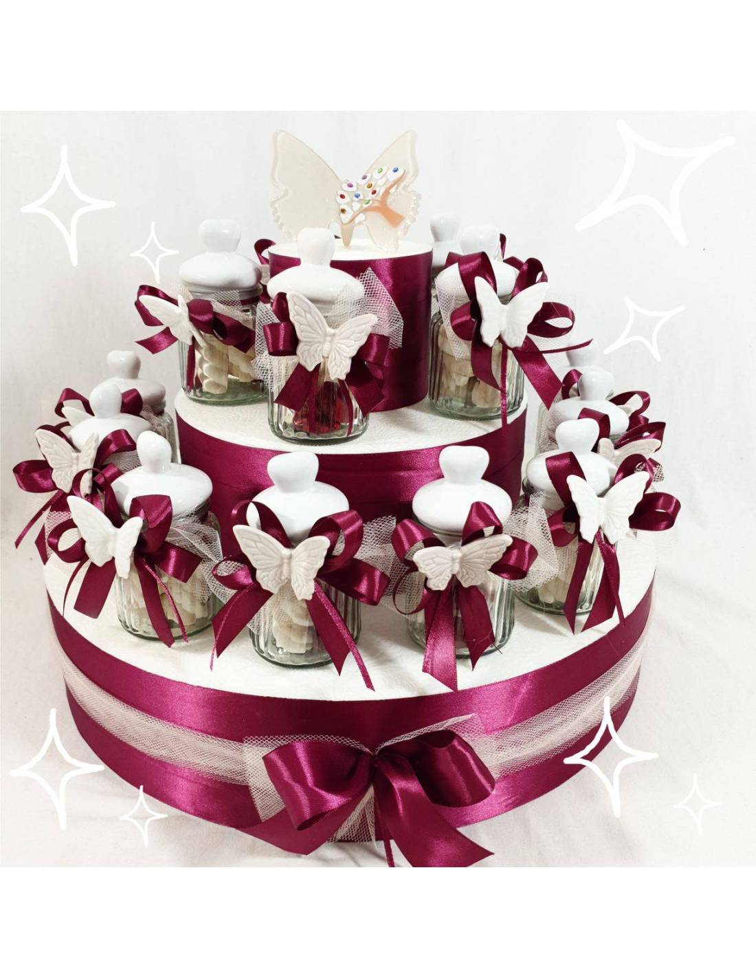 Vasetto con tappo a forma di cuore in ceramica bianca, fiocco con farfalla calamita nei colori panna e bianca in ceramica. Per ogni vasetto ci sono marshmallow e confetti. E' possibile acquistare la struttura completa di centrale farfalla firmata Gai Mattiolo e 20 barattoli a 110€ o il vasetto senza struttura a 4,40€. Spedizione gratuita escluse aggiunte