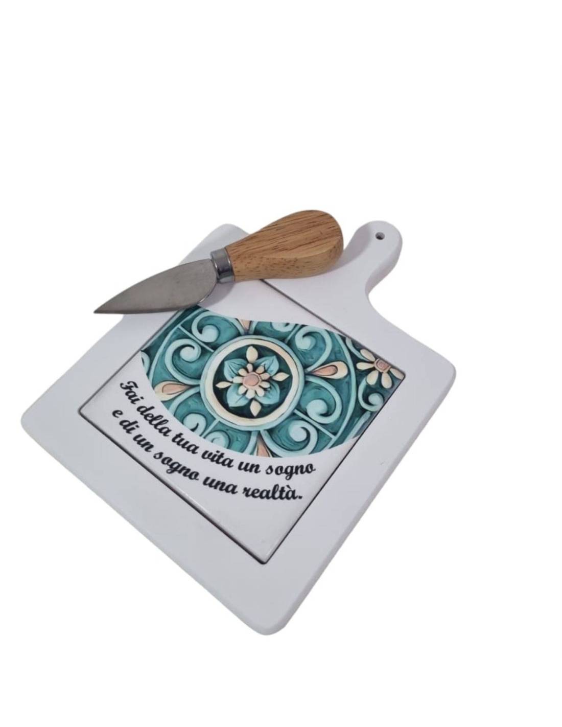 Bomboniere utili per matrimonio tagliere, legno e polvere di ceramica con decoro stile maiolica.