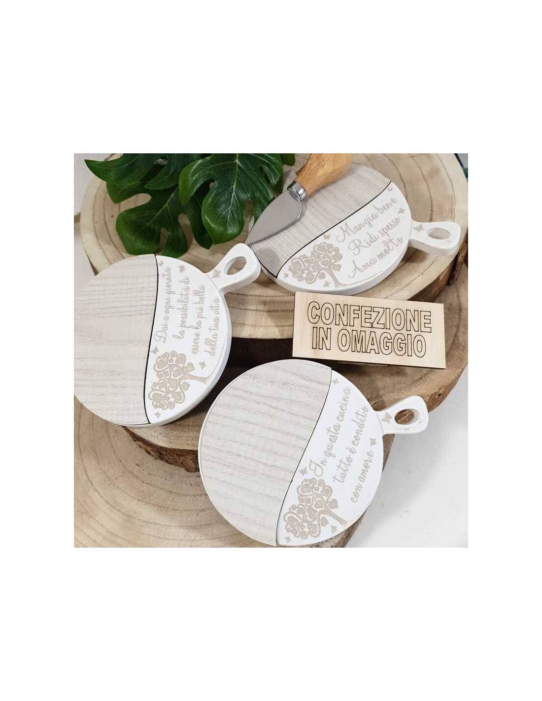 Bomboniera tagliere formaggi set con coltellino per formaggi, design moderno decorato con frase e albero della vita.