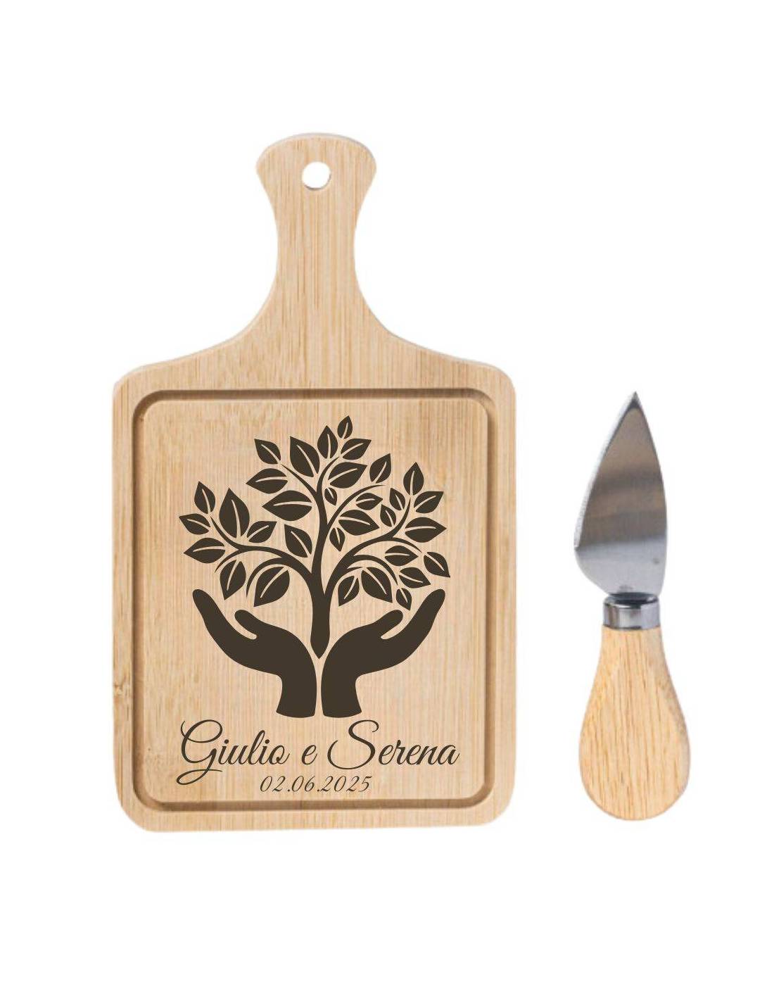 Bomboniere tagliere inciso, bellissima idea come bomboniera originale ed utile completa di forchetta.