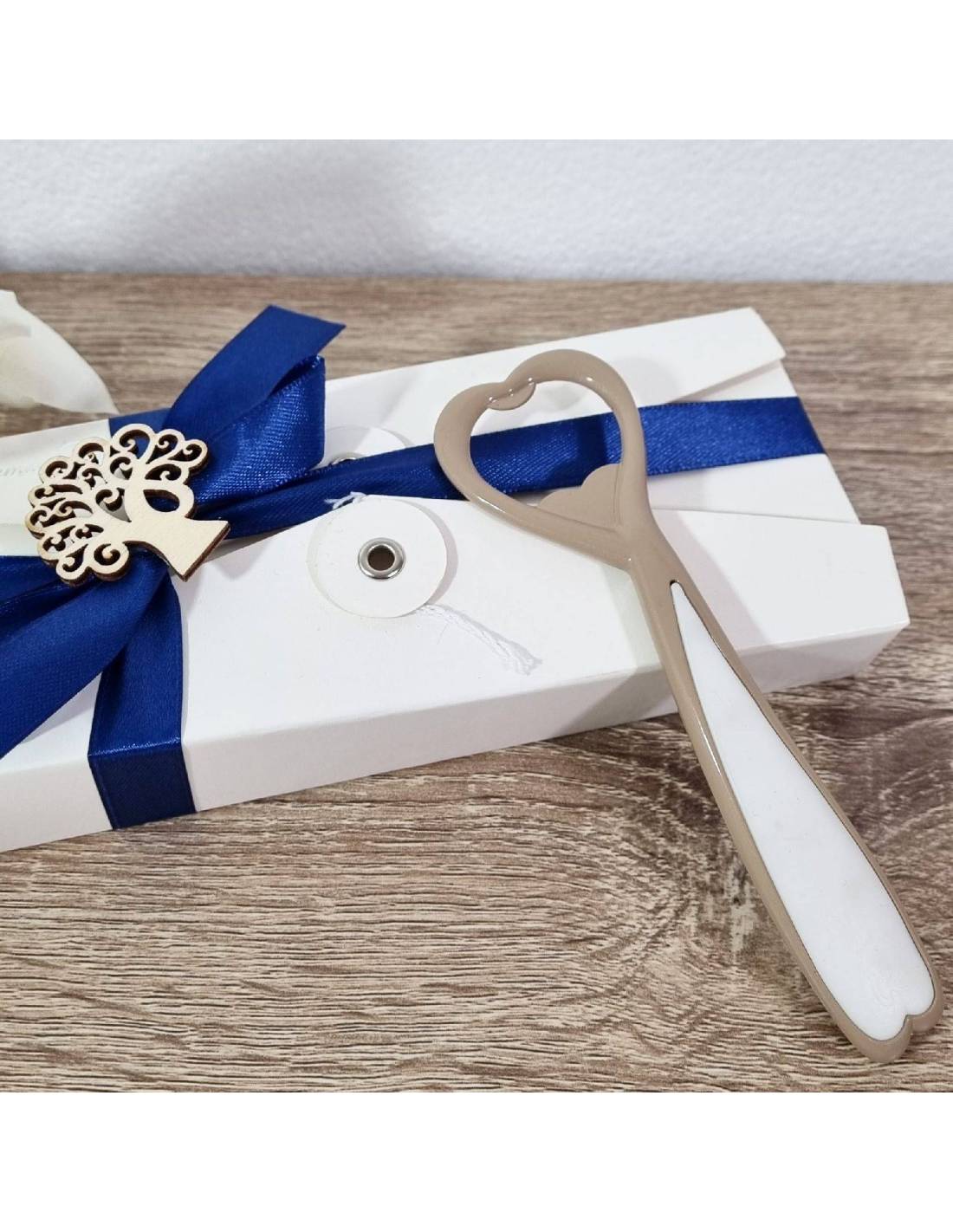 Bomboniere utili matrimonio apribottiglia in metallo lucido color tortora e manico in caucciù bianco con l'apertura a forma di cuore.