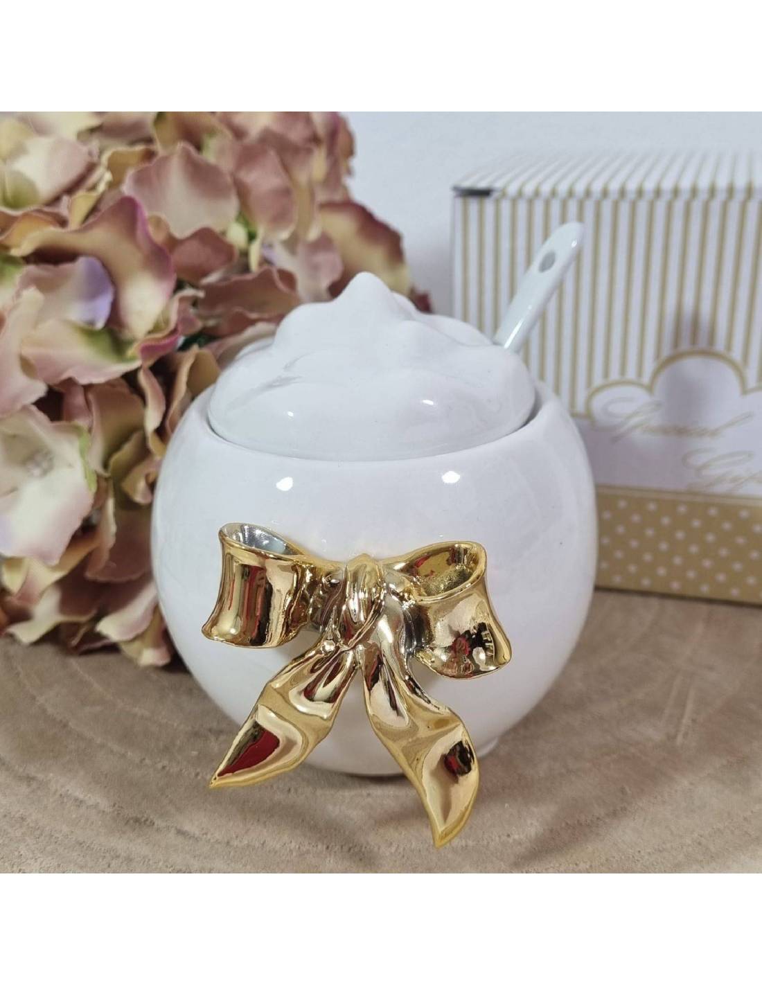 Bomboniera matrimonio zuccheriera in porcellana bianca completa di cucchiaino e decoro a forma di fiocco dorato.