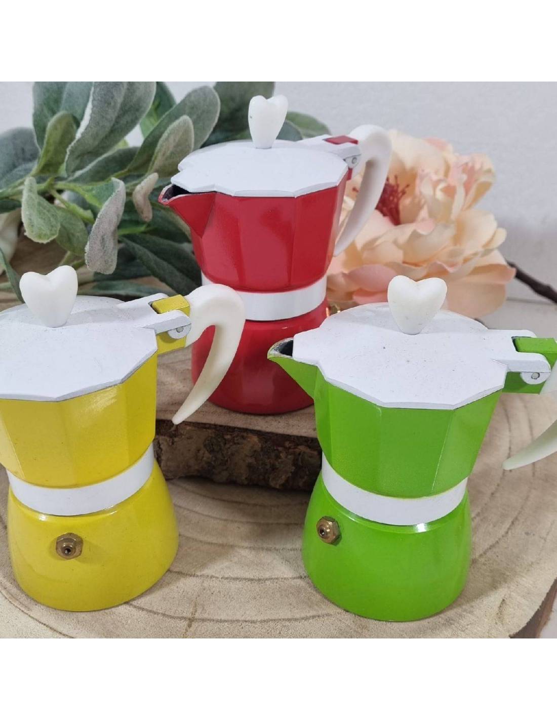 Idee bomboniere utili caffettiere in metallo in cinque colori rosse, verdi, e gialle.