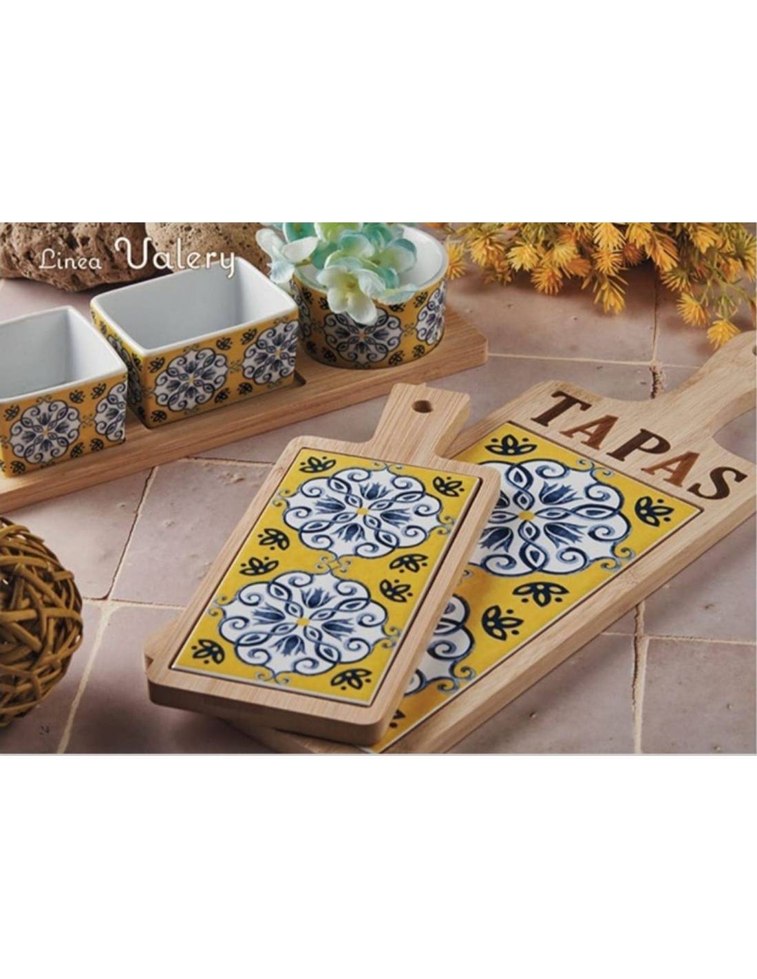 Bomboniere matrimonio taglieri in bambù fantasia maiolica dai colori giallo e blu.