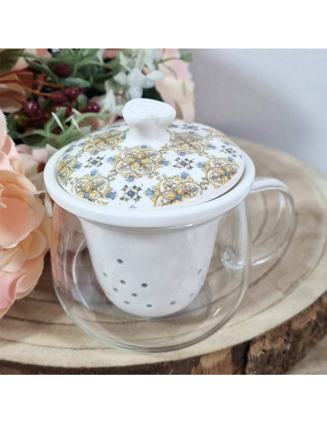 Tisaniera tazza in vetro con filtro in ceramica bianca e coperchio in ceramica decoro maiolica.