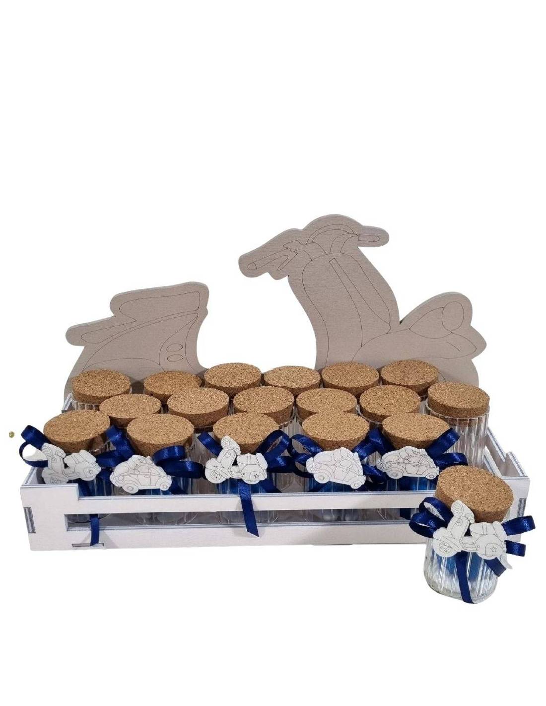 Portaconfetti in vetro con tappo in sughero e il decoro di un fiocco in raso con al centro il tag i legno di una vespa e una macchina.
