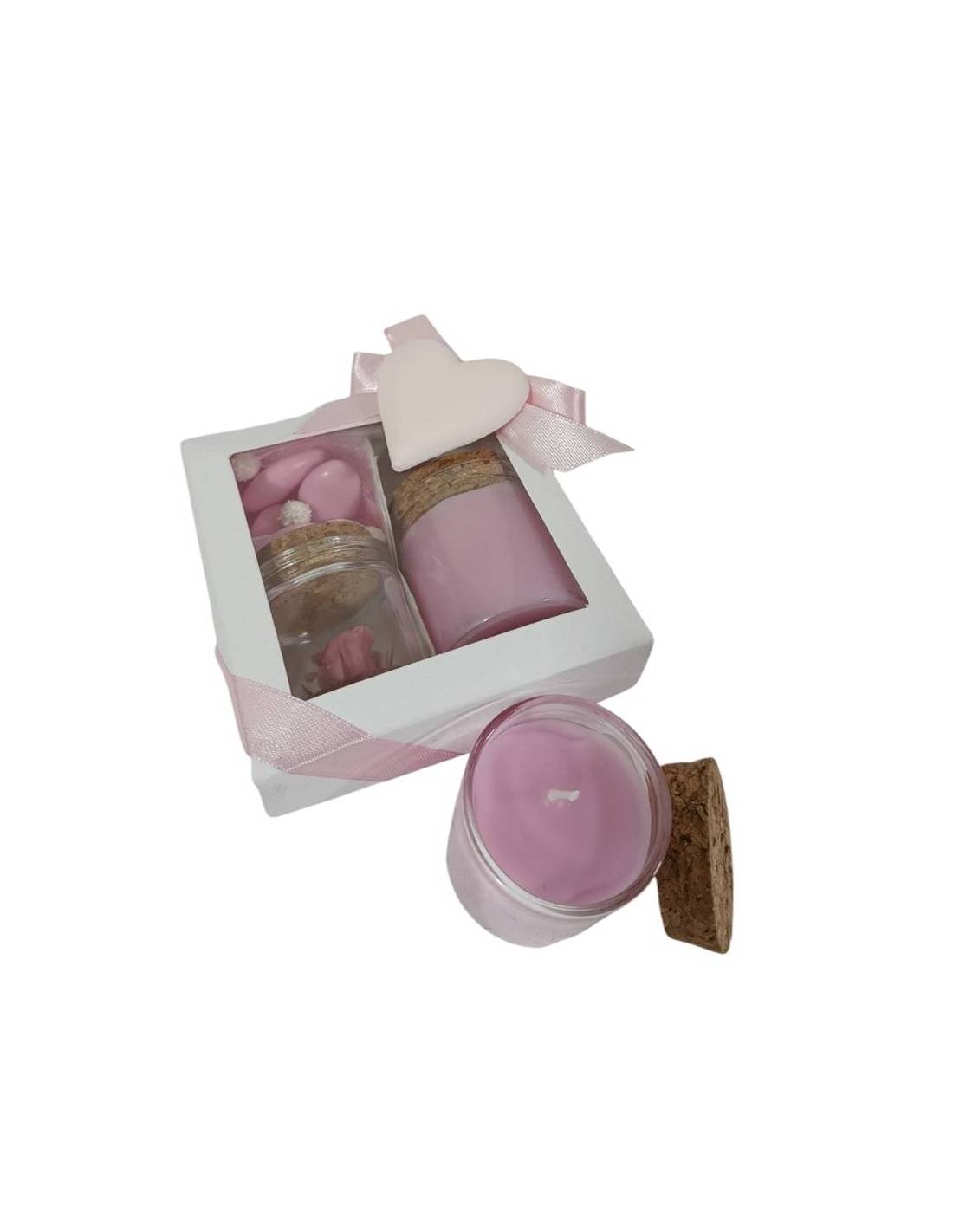 Nella scatola troverai 5 confetti rosa con zuccherini, rosa, candela tinta rosa (nelle fragranze dello stesso colore disponibili) e il bigliettino omaggio.