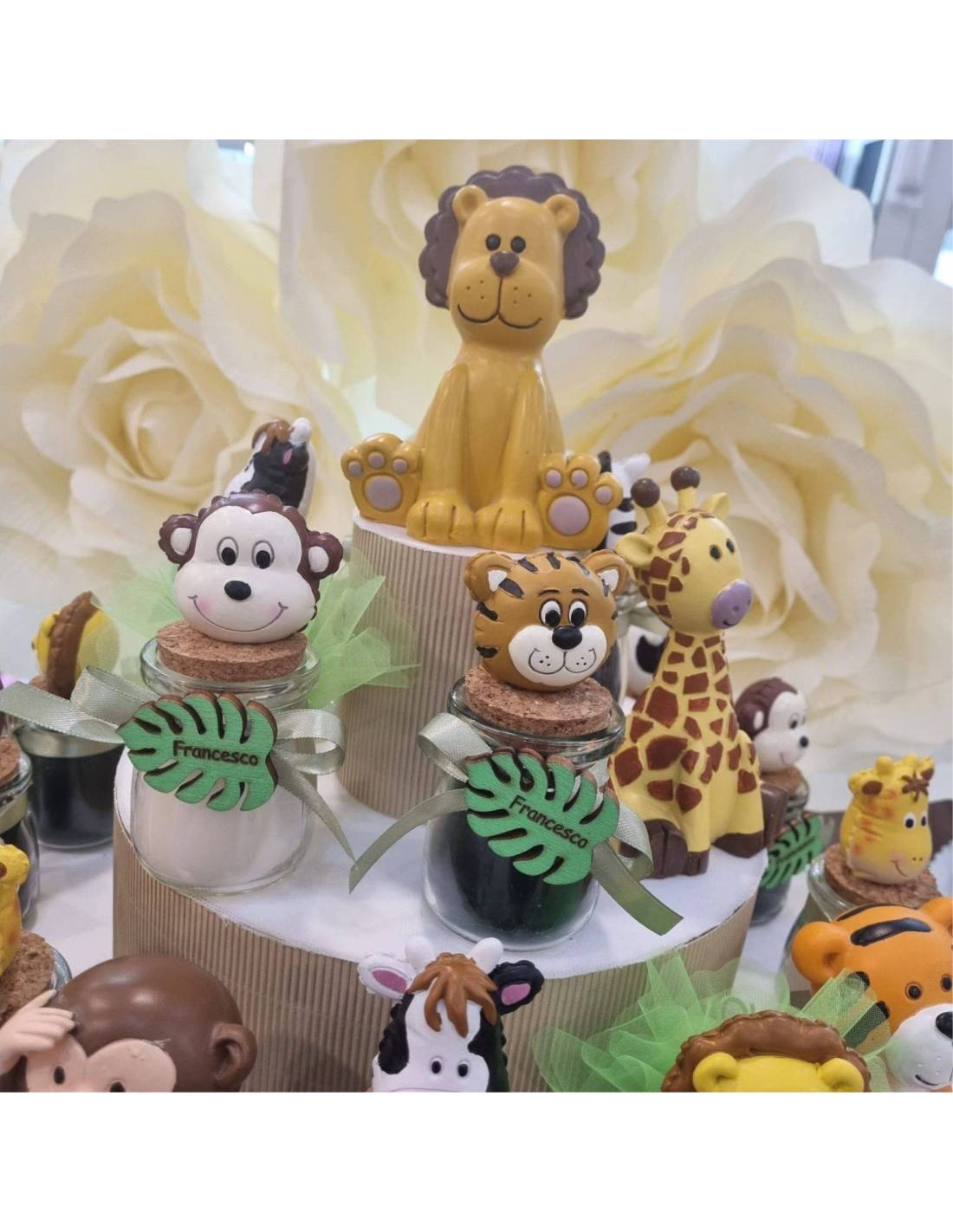 Su ogni candela bomboniera Battesimo c'è un animaletto che rappresenta la scimmia, la tigre, il leone, la zebra, la mucca completi di 5 confetti.