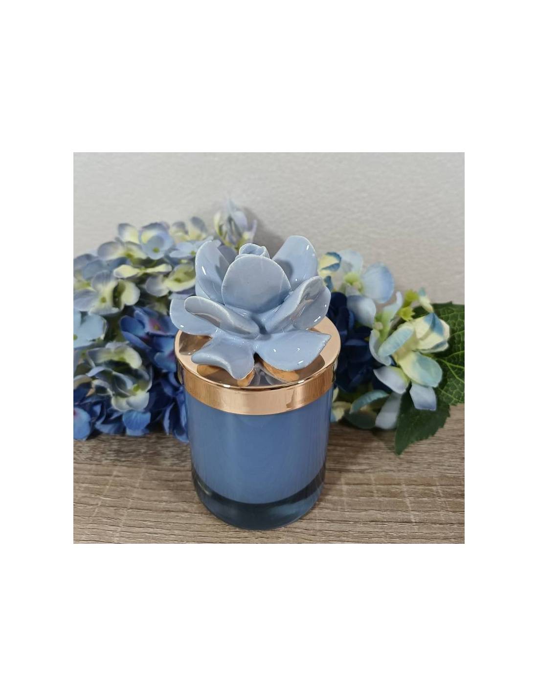 Una bellissima candela in vetro azzurro con fiore in ceramica