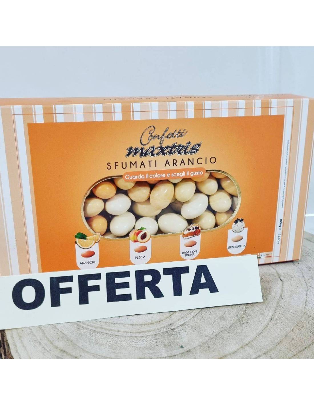I Maxtris sfumati arancione hanno 4 tipi di gusto diversi: babà con panna, pesca, arancia e stracciatella.