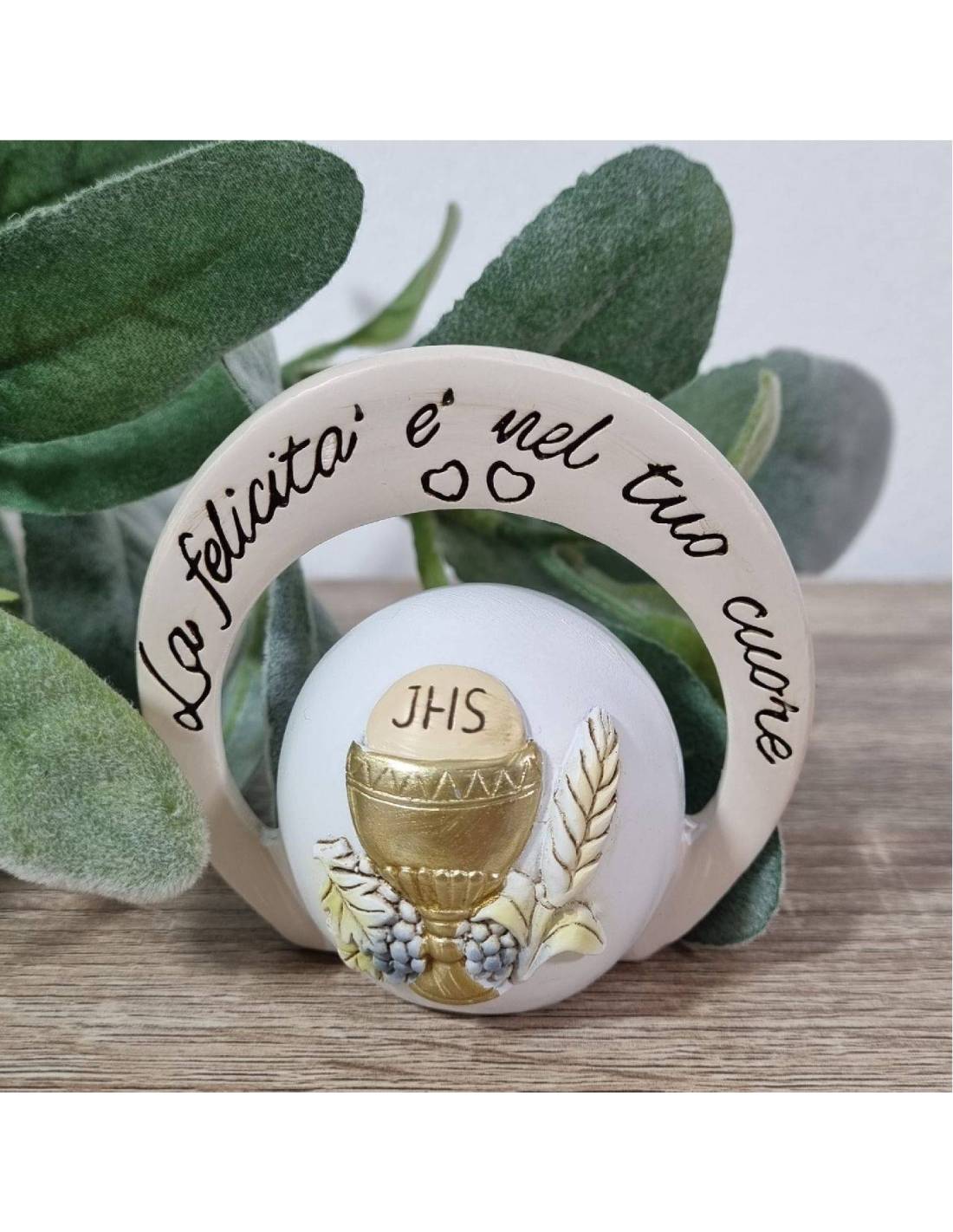 Bomboniere icona sacra prima comunione (Dimensione: 8 cm circa). La statuetta è a forma tonda con immagine dell'Eucarestia con l'uva, il calice e l'ostia che sono i simboli della prima comunione. Le statuine d'appoggio per comunion effetto pietra di grande effetto hanno la frase incisa "La felicità è nel tuo cuore".