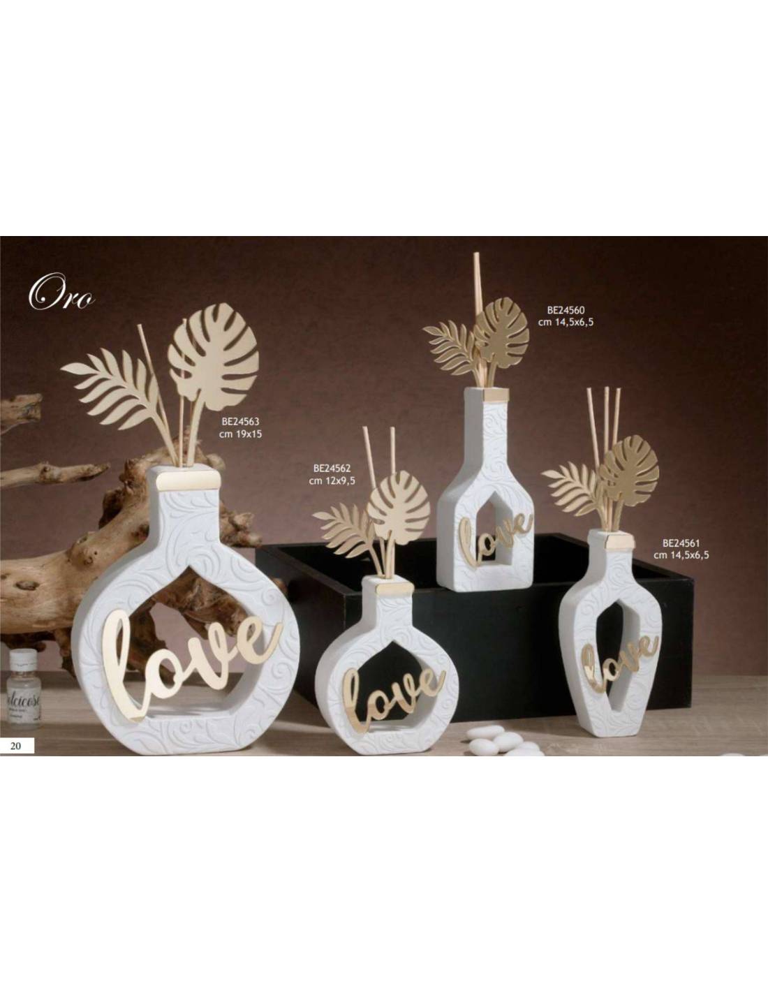 Profumatori ambiente Dolcicose che rappresentano bottiglie con scritta 'Love' dorata con quattro formati differenti.